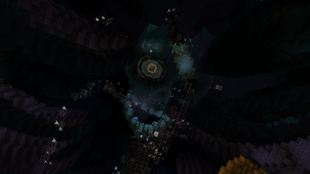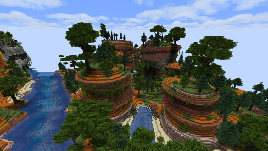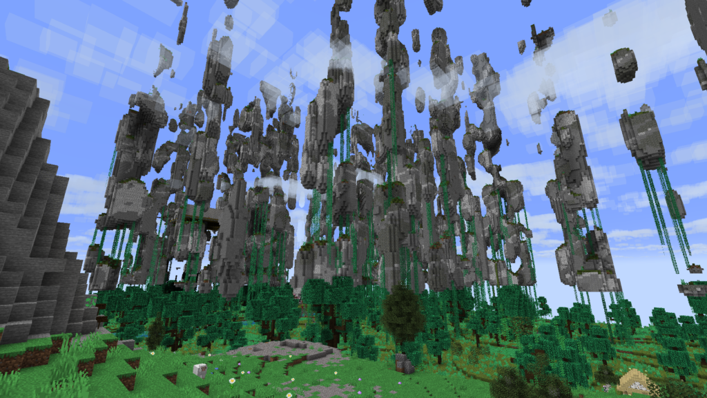 Here’s where Vernearth gets interesting: the terrain generation is genuinely impressive. We’re talking custom biomes with hanging rock formations, colour-shifted water using what appears to be Biome Painter, and naturally generated concrete powder creating salt-flat aesthetics. One location featured layered cliffs that looked like something from an amplified world. You’ll find yourself stopping for screenshots constantly.